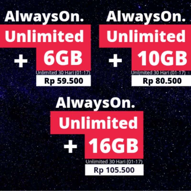 Dan durasi paket 3 unlimited ini cukup panjang yaitu 30 hari. Unlimited 10GB AlwaysON. Produk AlwaysOn Unlimited tersedia dalam dua varian.